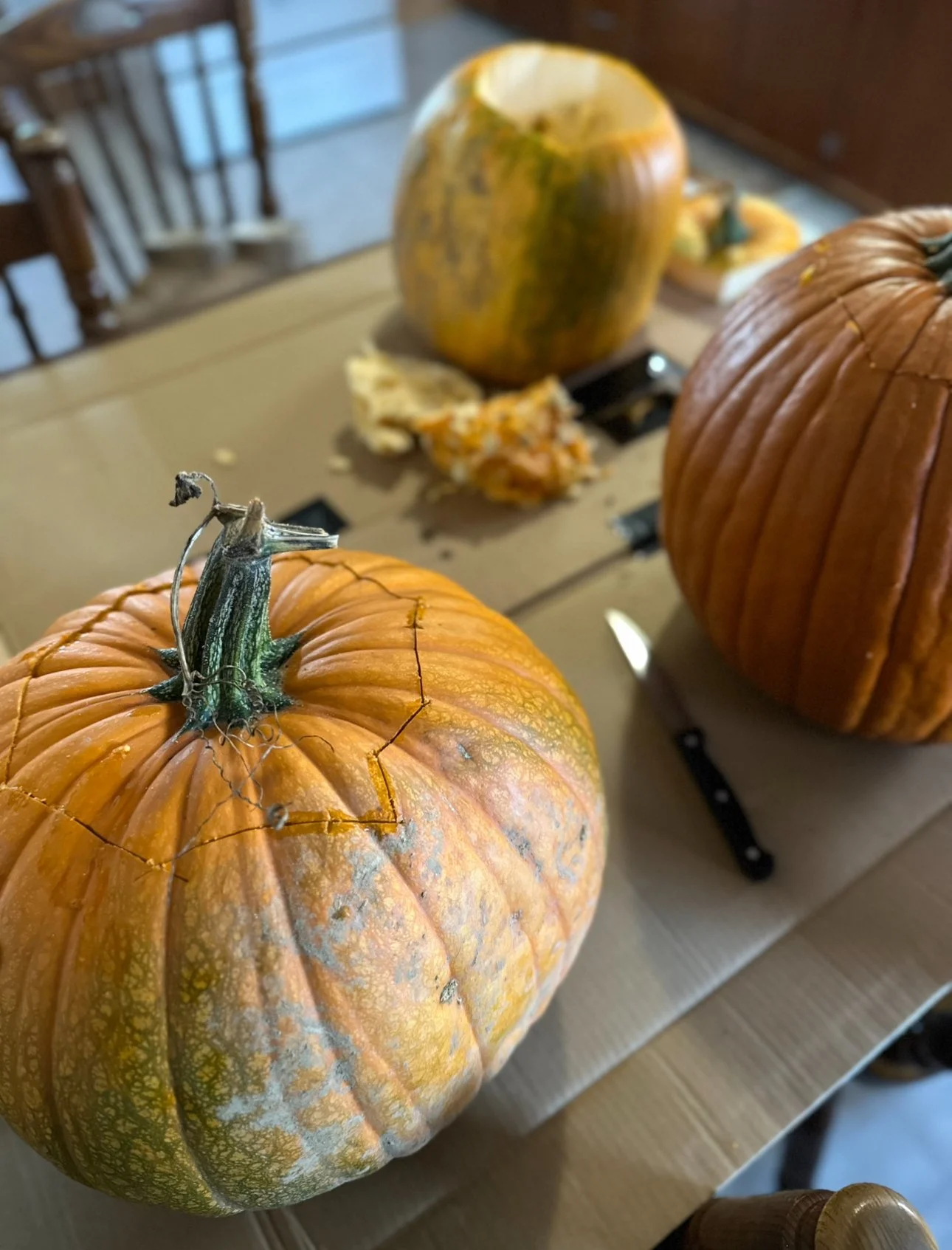 We have nine big pumpkins this year, three of which my girlfriend's father grew for each of her daughters—a yearly tradition of theirs. Unfortunately, one was completely rotted through the bottom—discovered only when one tried to pick it up and their hand about went straight through into what can only be described as pumpkin soup. The other eight survived the quality check and none of them attempted to consume anyone's hand, so we're calling it a win.