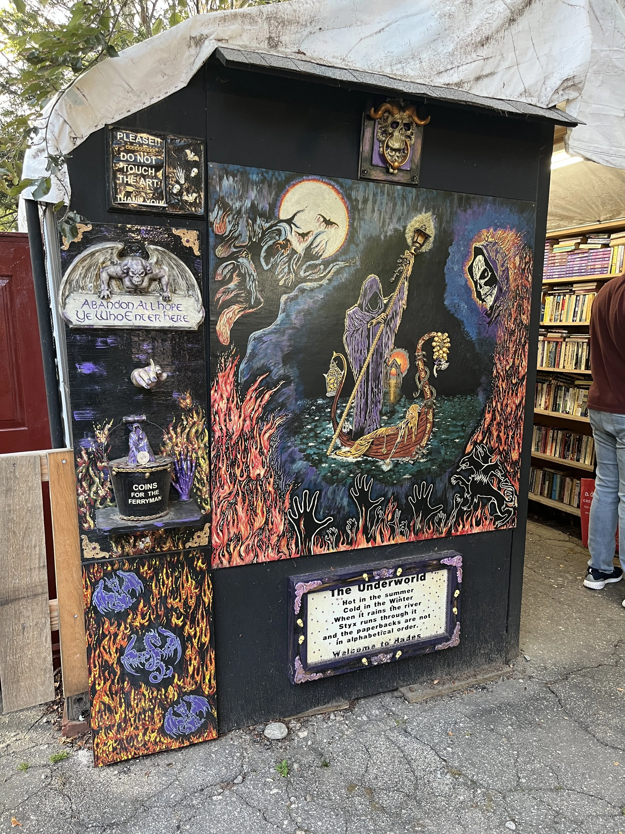 We had plans at a friends house for a classic autumnal bonfire, the perfect night for it too. Just the right amount of chill in the air and fallen leaves on the ground. But considering we had to travel a ways to get there, we decided to make the most of our journey and ended up at the Book Barn in Niantic, CT. Book Barn was unique in that instead of one singular building, there were multiple themed stations on the property, each housing the different genres that you’d expect to see in a standard book store. Best part? Lots of them had been gussied up for the Halloween season.