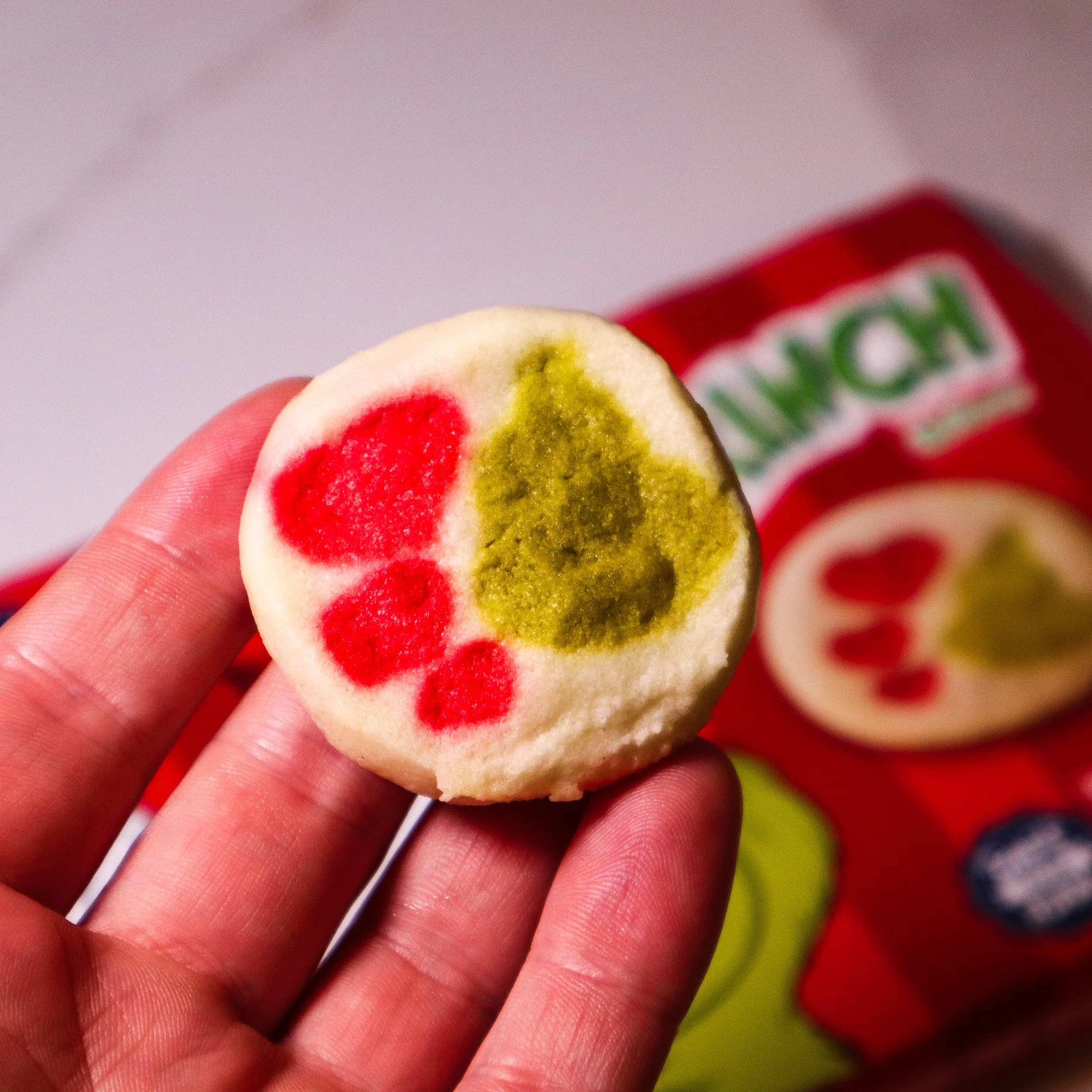 Somewhere in Whoville, someone's getting fired. These cookies, which were meant to capture the essence of everyone's favorite green Christmas killjoy, instead look like what you'd get if an alien tried to recreate cat paw prints based on a blurry photograph. I assumed after baking, the promises of the Grinch's head and his growing heart would present themselves but, again, what you’re left with looks more like evidence from an extraterrestrial veterinary clinic. Taste-wise, it's the same sugar cookie that gets a costume change for every holiday – ghost shape for Halloween, shamrock for St. Patrick's, and now... space toe beans for Christmas. How the Grinch Stole Cookie Originality. 6/10