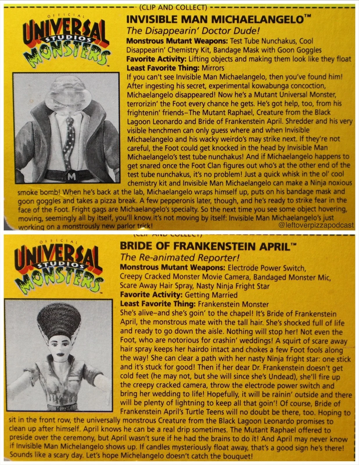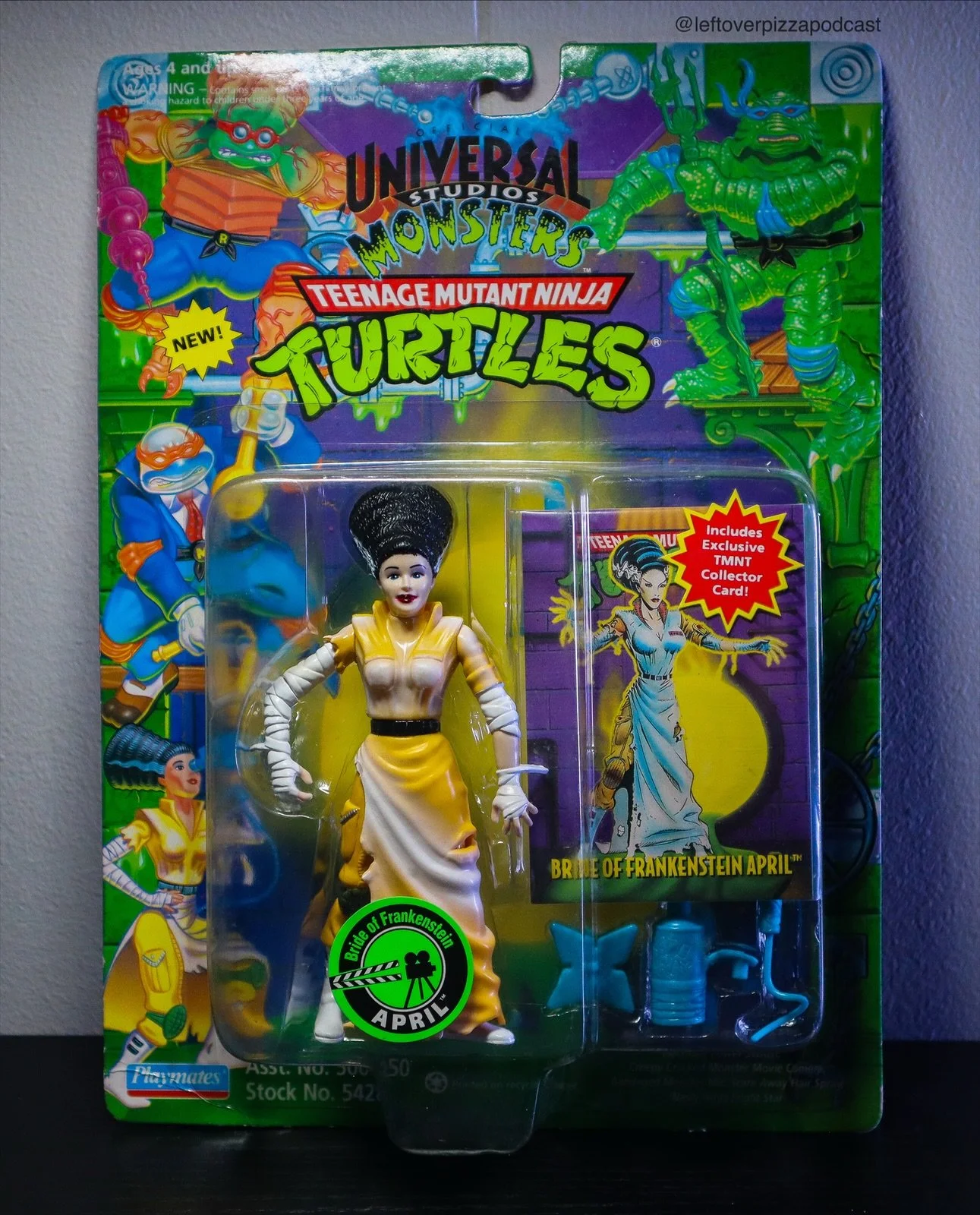 The line must have found some success because a second set was released the following year. The 1994 batch featured Invisible Man Michelangelo, Creature from the Black Lagoon Leonardo, The Mutant Raphael (a somewhat redundant concept), and April as the Bride of Frankenstein. I'll admit to feeling a twinge of disappointment that Donatello was excluded from this round, but the novelty of seeing April with that iconic white-streaked beehive somewhat makes up for it.