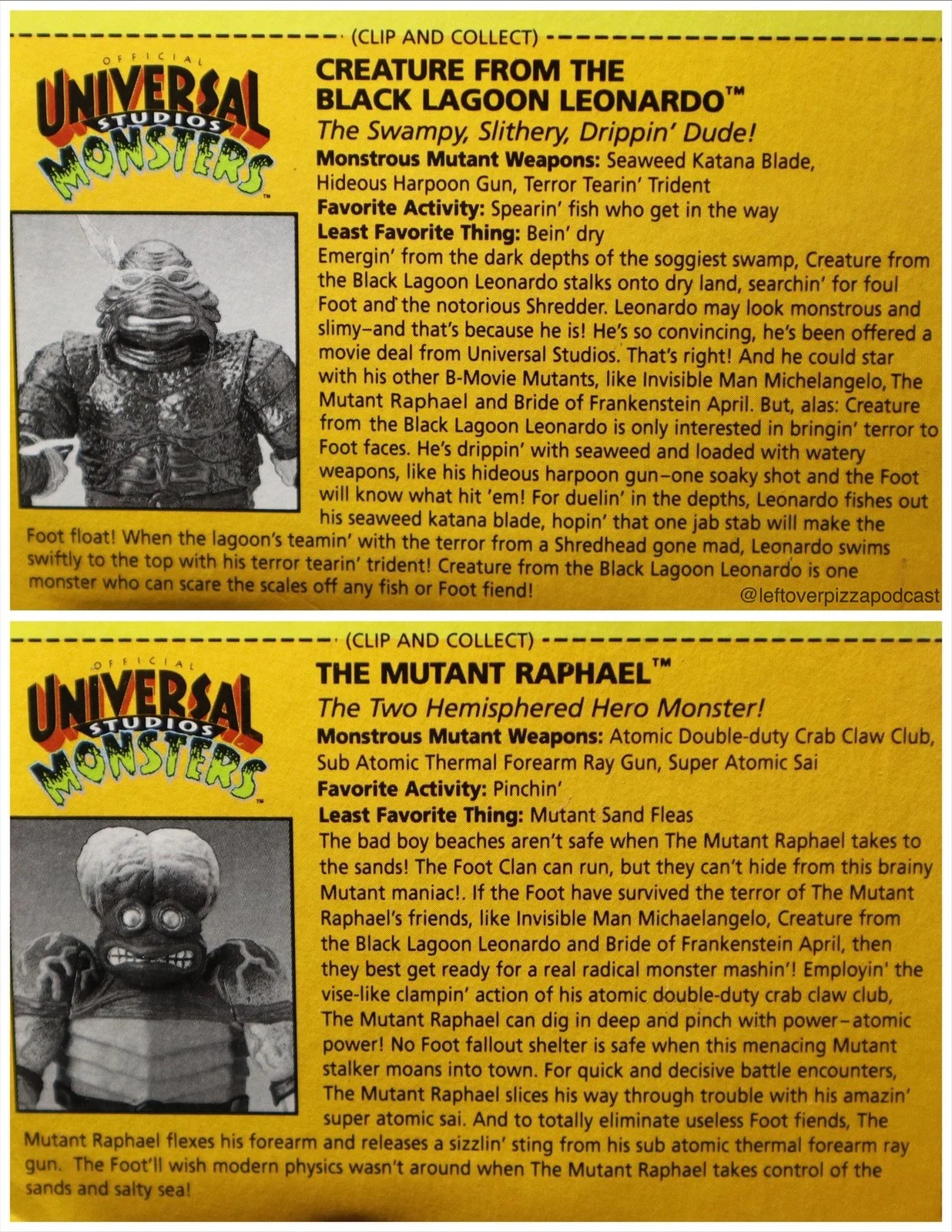 For those born in later years, the concept of horror-themed TMNT figures marketed to children might seem bizarre. But trust me, in the context of the early '90s, it made a strange kind of sense. TMNT was at the height of its popularity, while Universal Monsters were experiencing a resurgence, appearing on everything from postage stamps to Pizza Hut and Pepsi promotions. A collaboration between these franchises seemed almost inevitable.