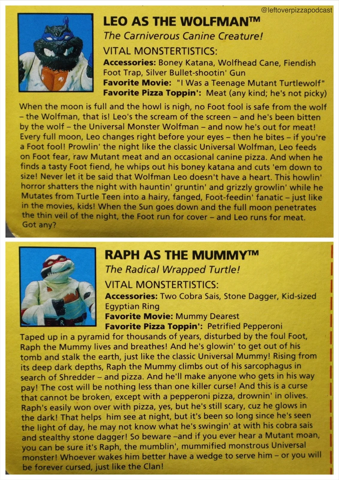 The initial wave included Leonardo as the Wolfman, Donatello as Dracula, Michelangelo as Frankenstein's Monster, and Raphael as the Mummy. True to form, Playmates Toys equipped each figure with a unique character biography and a close up weapons list on the packaging. I've taken the liberty of photographing these for posterity. They're worth a read, if only to appreciate the beautiful absurdity of concepts like "bolt-handled nunchucks" and Donatello's newfound "thirst for the blood of foolish Foot villagers." If all that wasn’t enough, these dudes GLOW IN THE DARK!