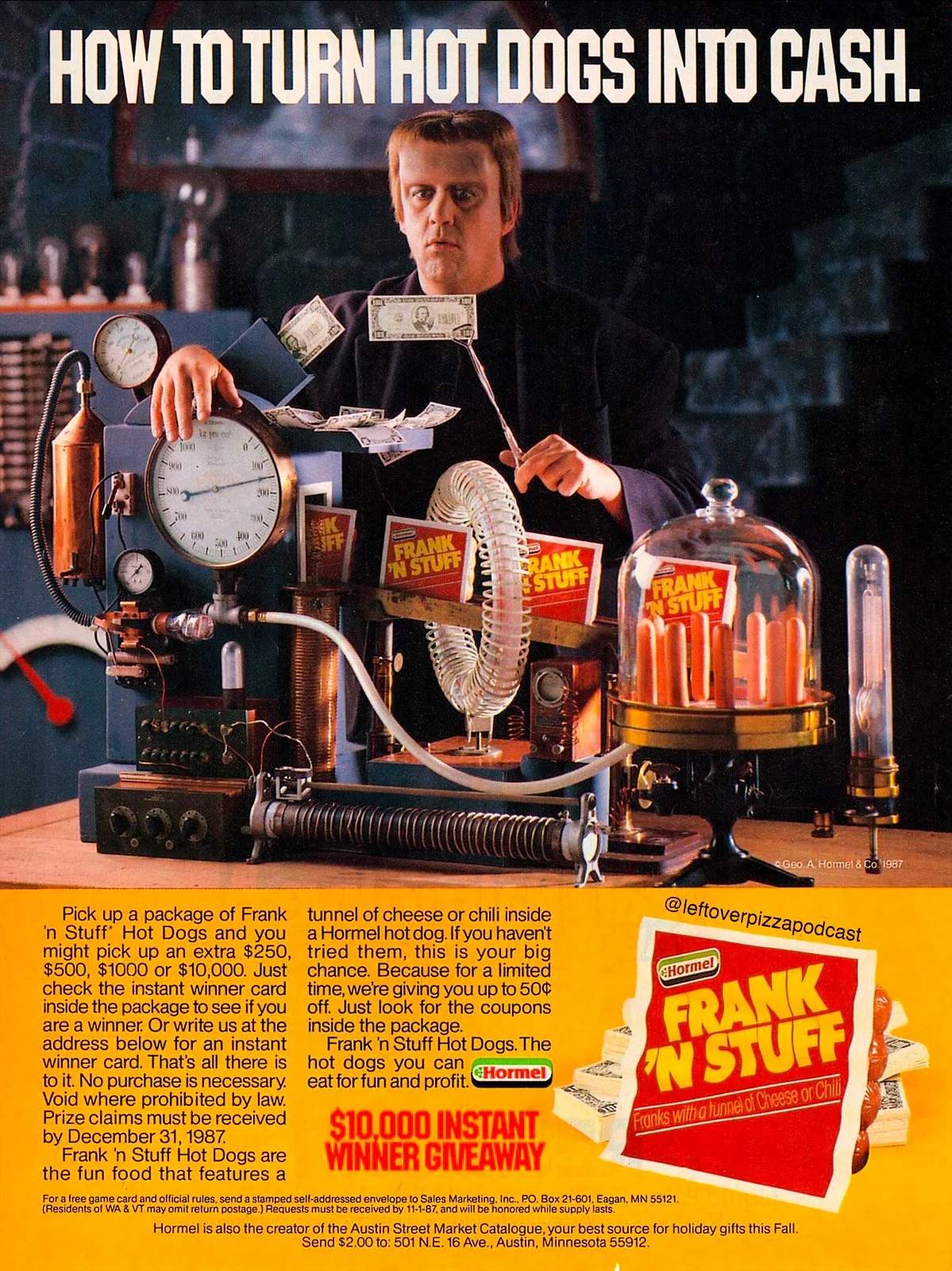 Most of you already know the glory that is Frank N’ Stuff Hotdogs by now - a whacky monster fronted line of hotdogs stuffed with chili or cheese from Hormel. Perhaps it’s news to some that there was at one point a $10k instant winner giveaway promo in 1987.