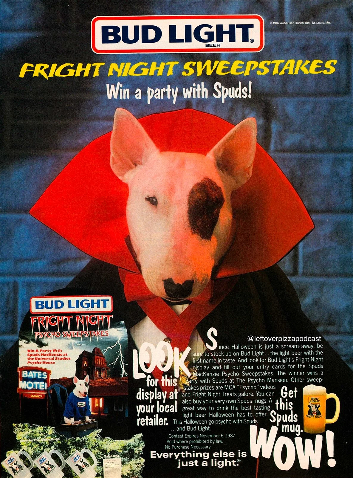 While a ton of the Halloween ads from Bud Light were fronted by beautiful busty goth women, a few were fronted by our pal, Spuds MacKenzie - a bull terrier mascot who took the late 80s by storm.