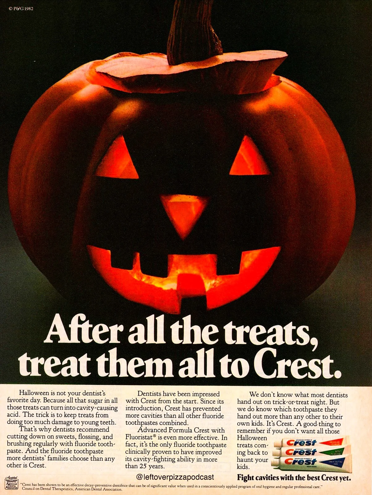 Regardless, Crest has made a nice simple scene here with a jolly jacko grinning from ear to ear to advertise their Advanced Formula with Flouristat to ensure those Halloween treats don’t come back to haunt your kids teeth. It's a win-win: kids get candy, dentists get business, and Crest gets to be the hero.