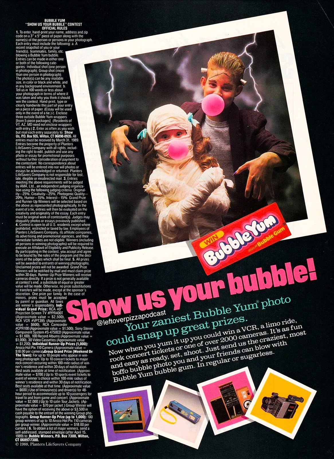 "Show us your bubble!" Bubble Yum proclaimed in 1988, apparently oblivious to how that phrase might tickle our modern funny bones. But, I digress - the ad features a couple of costumed kiddos channeling their inner monsters in pursuit of the era's hottest tech treasures. In simpler terms - LITTLE MONSTERS BLOWING BUBBLEGUM FOR VCRs!