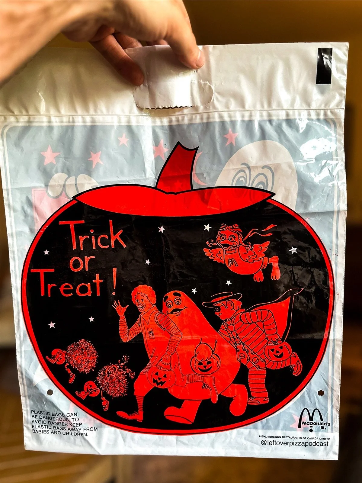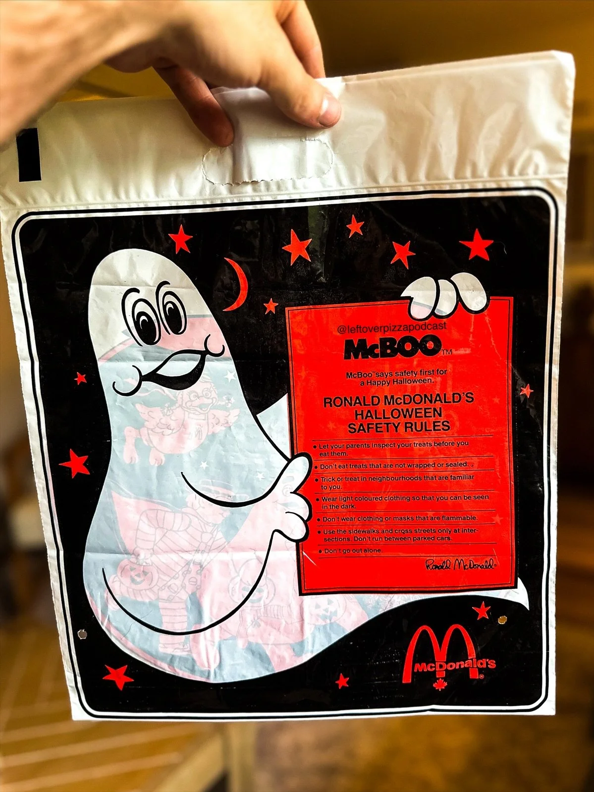 Before McBoo made his way to pail form (unintended pun), he haunted many McDonalds items including Halloween certificates and trick-or-treat bags. For example, well… this bag right here.