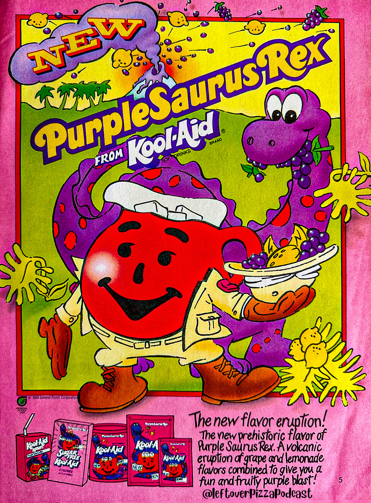 Fun fact, Purplesaurus Rex Kool Aid comes from grape and lemon filled volcanoes - a prehistoric eruption of flavor!